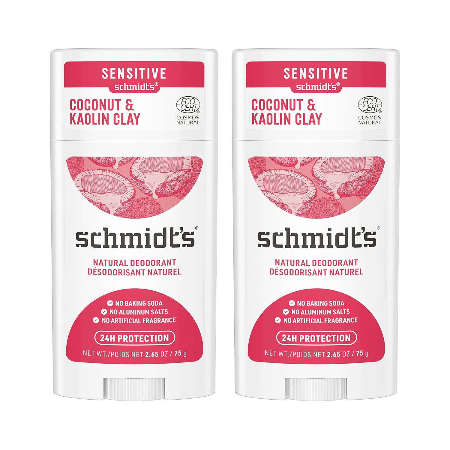 Schmidt's Aluminum Free Natural Deodorant Coconut & Kaolin Clay 2-pk for Women and Men, with 24 Hour Odor Protection, Certified Natural, Cruelty Free, Vegan Deodorant 2.65oz