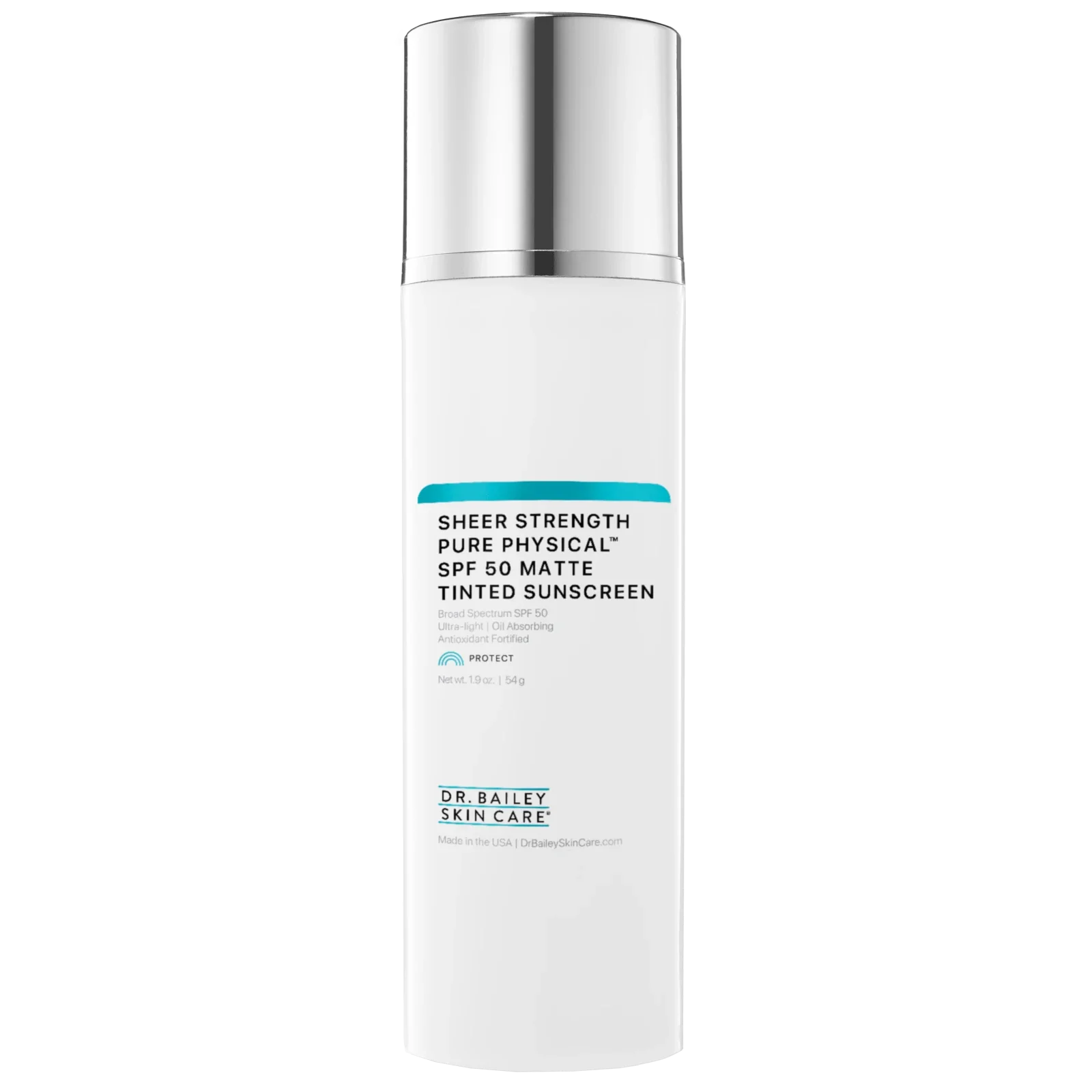 Sheer Strength Pure Physical™ Matte Tinted Creme Sunscreen, SPF 50 with ultra-light texture, oil control and a tinted matte base formulated in a pure mineral hypoallergenic sunscreen – it’s the SPF holy grail, ideal for all skin types AND it is water-resistant to 80 minutes!