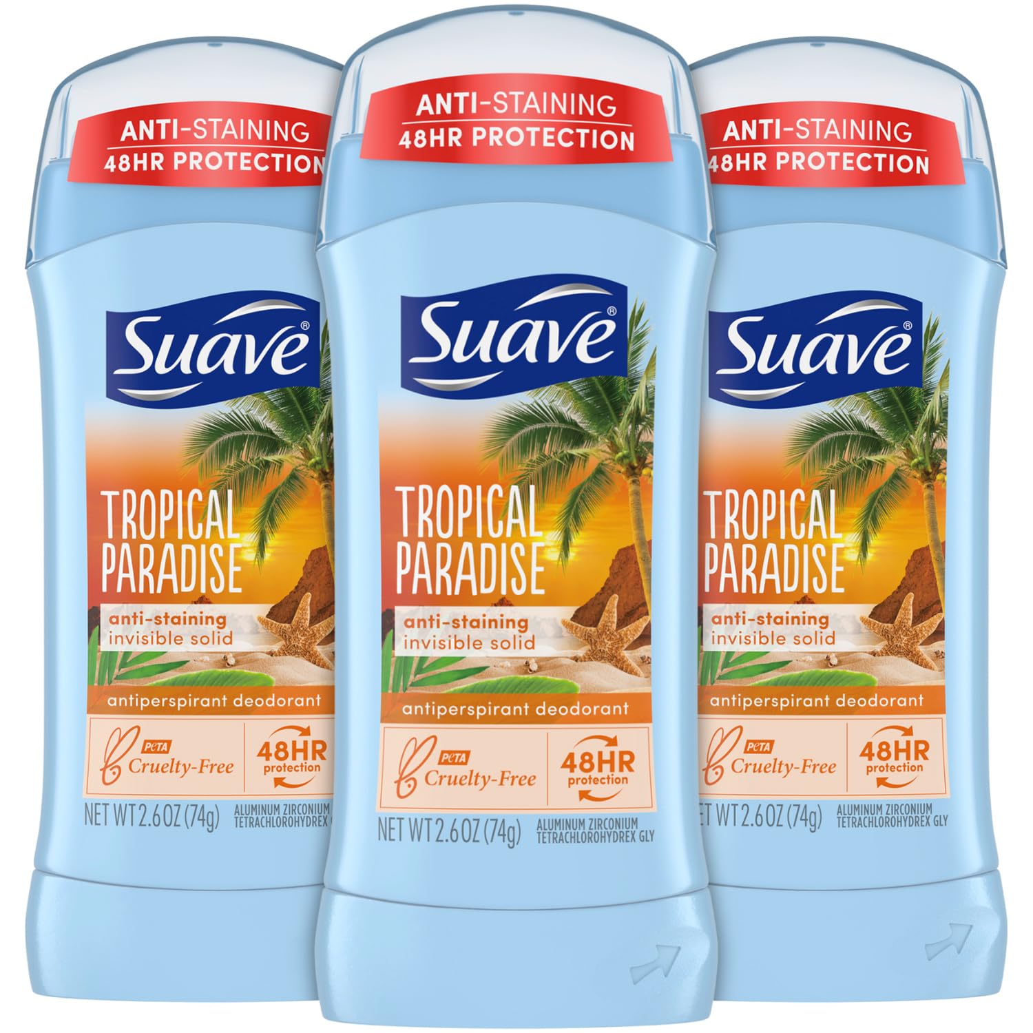 SUAVE TROPICAL PARADISE 3-PACK: Stock up with the Suave antiperspirant deodorant value pack, featuring our Tropical Paradise Anti-Staining Invisible Solid sticks.